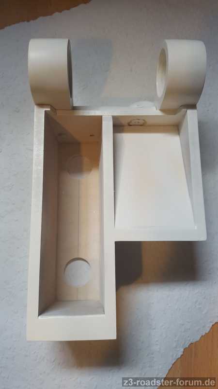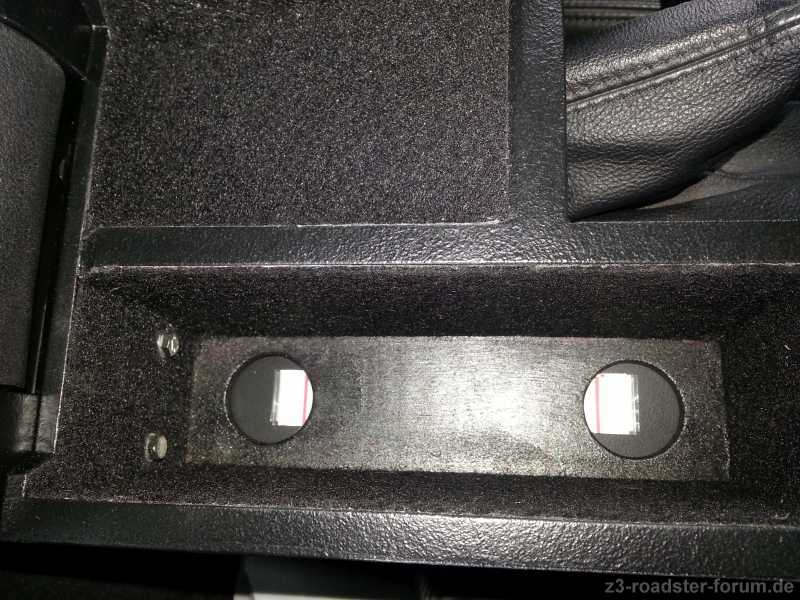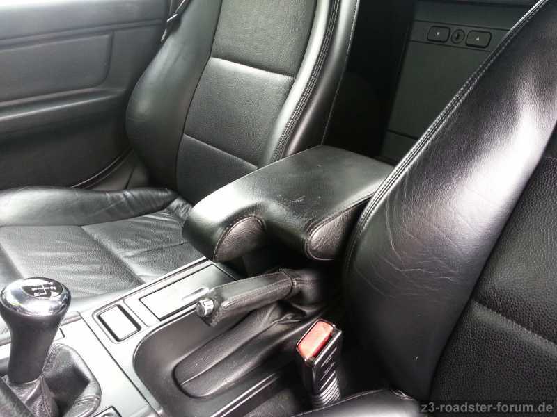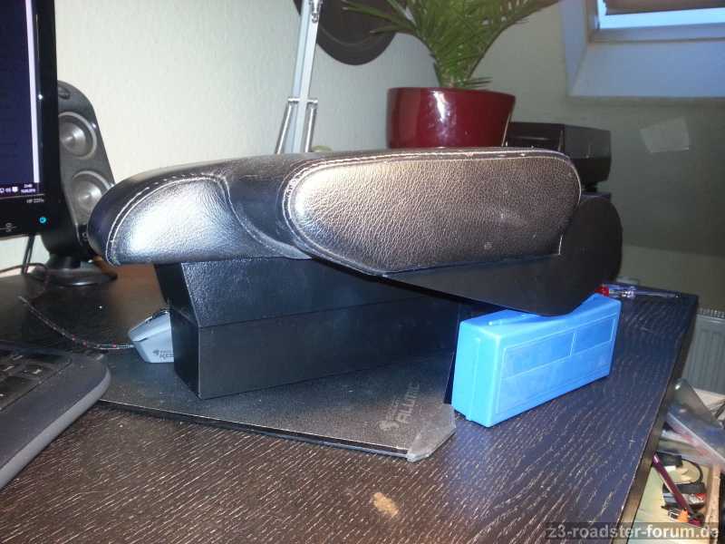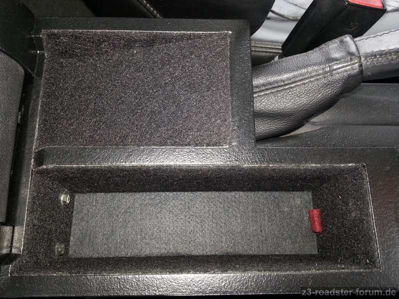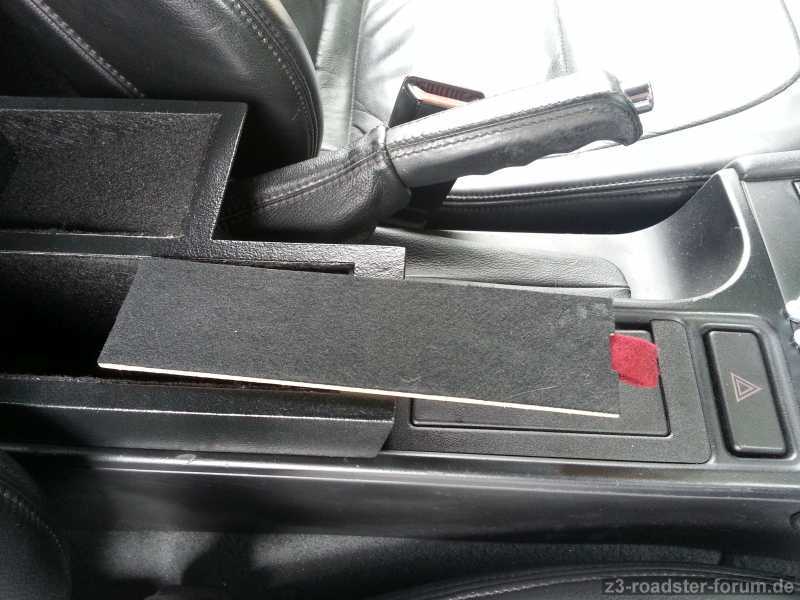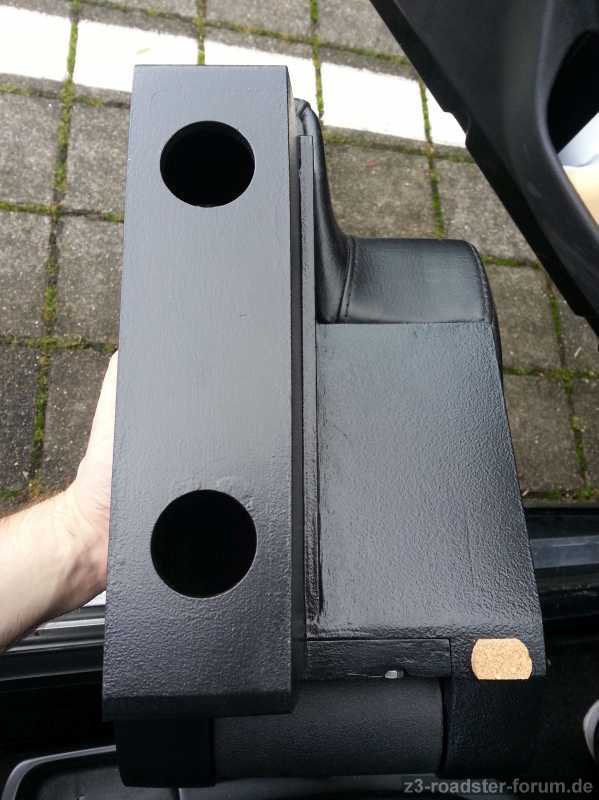 Hinter der Aussparung für die Handbremse musste ich noch einen kleinen Kork-Puffer einsetzen. Leider war mir bis heute entgangen, dass die Mittelkonsole zur Fahrerseite hin ca. einen Zentimeter abschüssig ist. Das Ergebnis war, dass die Armlehne minimal nach links gekippt ist, sobald man sich etwas unvorteilhaft darauf gelehnt hat. Da der Puffer aber im absolut nicht einsehbaren Bereich montiert ist, war es mir den Aufwand jetzt nicht wert, alles nochmal abzuschleifen und ein Stück Holz anzuleimen. In den Plänen werde ich das aber entsprechend korrigieren.