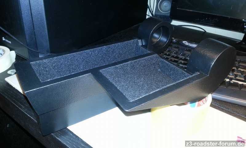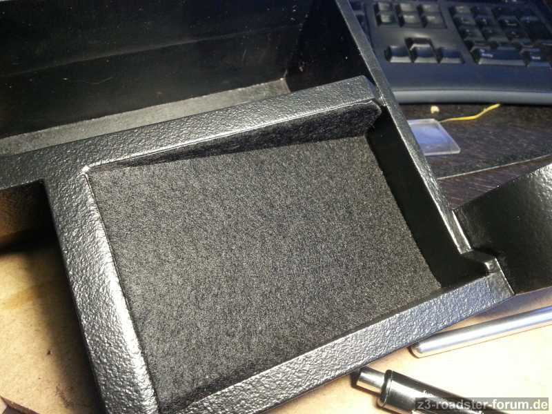 Das Zeug ist aber wirklich mit Vorsicht zu genießen. Es klebt zwar wie sonst was, hat andererseits aber auch die Oberfläche des schwarzen PU-Lacks, den ich zum Lackieren verwendet habe, angegriffen. Teilweise hat sich dieser nach wenigen Sekunden komplett in eine schwarze, klebrige Masse verwandelt. Ich musste also penibel aufpassen, nicht auf eine später sichtbare Lackstelle zu kommen. Hat aber soweit alles funktioniert. Dafür dass ich zum ersten mal etwas mit Filz verkleidet habe, bin ich mit dem Ergebnis zufrieden, auch wenn es an den Rändern sicher nicht 100 % perfekt ist. Der rote Filz hat übrigens doch noch Verwendung gefunden. Als Griff für die Bodenplatte der der Unterkonstruktion. Hier hab ich nämlich einen doppelten Boden eingesetzt, damit ich die Armlehne mit TESA Powerstrips fixieren und diese bei Bedarf durch die Öffnungen wieder abziehen kann. Eigentlich klemmt die Armlehne sich ja bereits von selber in der Ablagemulde fest, aber sicher ist sicher. Man muss ja leider auch an Situationen wie Unfälle denken und da wäre es sicher nicht so vorteilhaft, wenn die insgesamt knapp 1 kg schwere Konstruktion fliegen geht ...