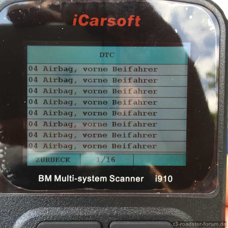 - Fehlercode 04 "Airbag vorne, Beifahrer" wird über 16 Seiten im Diagnosegerät angezeigt (s. Foto 2)