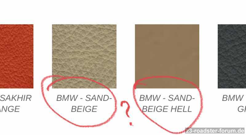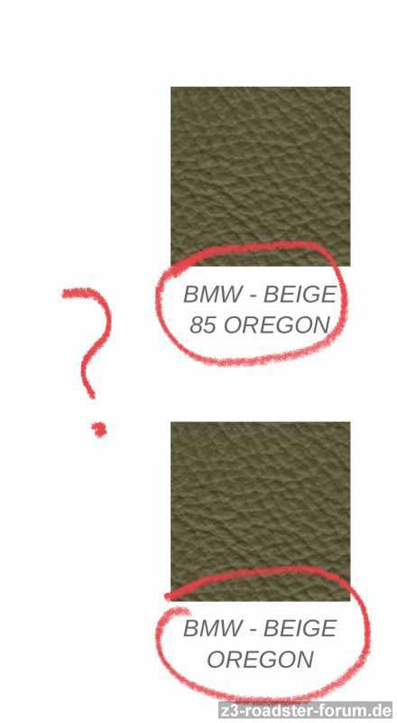 Zur Auswahl auf der Seite vom Lederzentrum.de habe ich: BMW beige 85 Oregon, BMW beige Oregon, oder BMW Sandbeige.