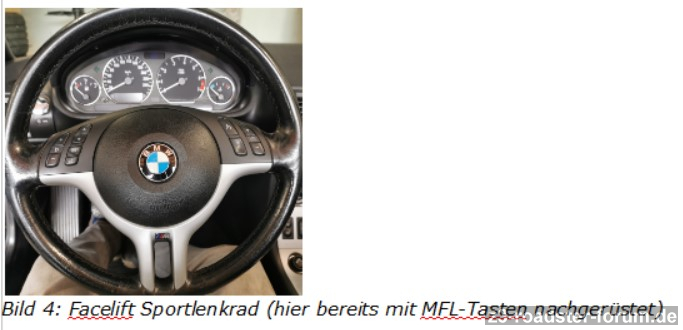 Es empfiehlt sich auf das Baujahr des Spenderfahrzeugs zu achten. Ab ca. BJ. '96/'97 wurden die MFLs geändert und (zumindest der Radiotastenteil) auf i-Bus umgestellt (Übertragung der gedrückten Taste per Botschaft auf dem Datenbus). Mit den älteren MFL-Einheiten bewirkt ein Tastendruck einfach eine Verbindung der Kommunikationsleitung nach Masse, jeweils über unterschiedliche Widerstandswerte je Taste. Je nachdem was man vor hat, spielt das eine wichtige Rolle.