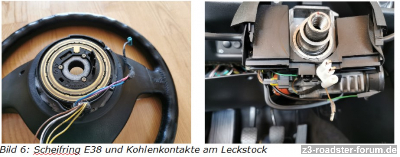 Beim Facelift bzw. zweistufigen Airbag ist es ein wenig (finanziell) aufwändiger. Hier haben wir bereits 6 Verbindungen (4x Airbag, 2x Hupe) in der Wickelfeder, benötigen mit den 3 zusätzlichen für die MFL-Tasten also insgesamt 9. Die einzige kompatible Wickelfeder die das kann, ist die 7-polige vom 7er E38 mit Lenkradheizung, denn diese hat eben für die Heizung zusätzlich zwei echte Schleifringkontakte (unsere benötigten Kontakte Nr. 8 und Nr. 9). Neben der Wickelfeder mit der Teilenummer 32341094262 (Bild 6 links, gut zu erkennen und zu unterscheiden an den beiden echten Schleifringen) werden als Gegenstück zu den Schleifringen die Kohlenkontakte mit der Teilenummer 32311091732 benötigt (Bild 6 rechts, das weiße Teil unter der Lenkstange). Der Z3 hat dafür freundlicherweise auch die Halterung am Lenkstock, also mechanisch immer noch alles Plug&Play!