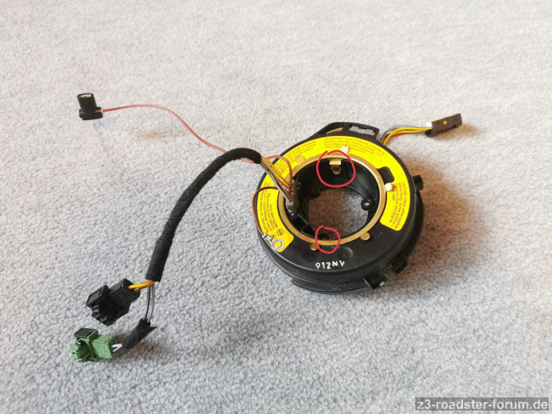 4. Schritt Wickelfeder öffnen. Dazu den Messingkranz abklipsen (von den beiden Nasen im Innenradius abheben, Bild 2) und beide Hälften auseinander nehmen. Keine Sorge, man kann da nichts wieder falsch zusammenbauen. Man muss das Flachbandkabel einfach nur wieder aufwickeln.