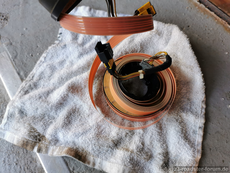 Achtung! Was aussieht wie eine Steckverbindung an der Wickelfeder (grau) ist KEINE trennbare Verbindung! Hier ist das Kabel fest mit dem Flachband verbunden.