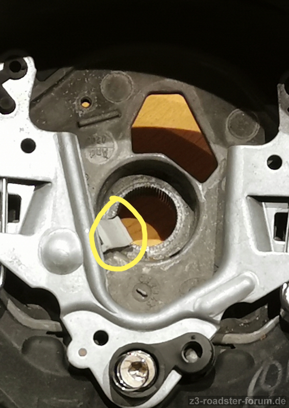 5. Schritt Wickelfeder schmieren. Die Flachbandwicklung etwas mit Silikonspray einsprühen damit die Windungen weniger aneinander reiben. Oben und unten wo Kunststoff auf Kunststoff reibt etwas mit 08/15 Fett (universal Maschinenfett usw...) einschmieren, auch den Metallkranz. Dann das Band halbwegs eng aufwickeln damit man es wieder zusammen setzen kann (Bild 3). Sollte sich nun schon leichtgängiger und geräuschfrei drehen lassen. Die Mittelstellung zum Verbau findet sich auch wieder leicht. Einfach bis auf Anschlag in eine Richtung drehen, dann bis zum anderen Anschlag. Das sind recht genau 5 Umdrehungen. Von da also wieder ca. 2,5 zurück, das ist die Mitte. Wieder ans Lenkrad geschraubt arretiert die Wickelfeder dann in dem Bereich in der korrekten Stellung, also aufsetzen und bisschen in die eine oder andere Richtung drehen bis es klickt. Zum nochmal überprüfen innen im Lenkrad an der Nabe das weiße Teil drücken zum Entriegeln (erfolgt bei Einbau durch die Zentralschraube die das Lenkrad auf die Lenksäule fixiert, Bild 4). Dann kann man die Wickelfeder auch am Lenkrad nochmal drehen und die Mittelstellung prüfen.