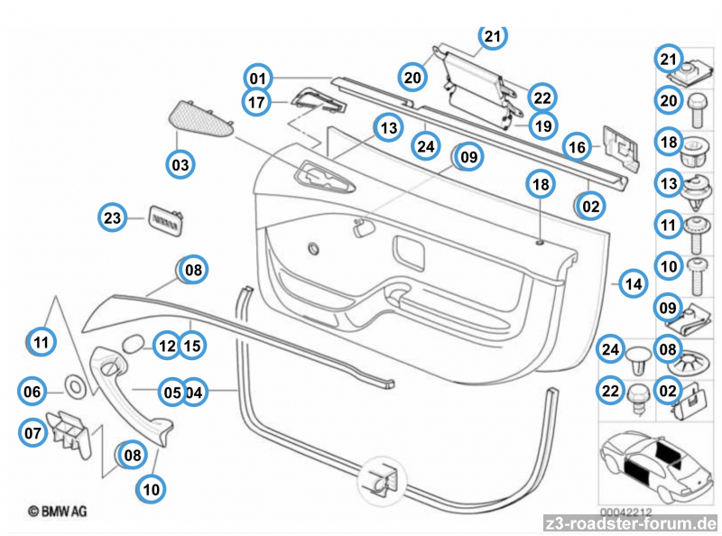 ich bin verzweifelt auf der Suche nach folgendem Teil(chen): 51418407768 … es scheint mir, dass es diese kleine Abdeckung für die rechte Seite nicht mehr gibt. Auf unten gezeigtem Bild handelt es sich um Nr. 17 (Quelle:Leebmann). Leider ist eine der Nasen abgebrochen, weshalb sie sich nicht mehr fest positionieren lässt und anfängt bei der Fahrt zu klappern. Bevor ich sie festklebe wollte ich einmal in die Runde fragen, ob jemand Erfahrung damit hat oder weiß, ob es dieses Teil doch noch irgendwo gibt?!