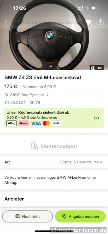 Laut Bild der Rückseite passt der Lenkradkranz auf den Z3 (Z4 und E46 ist damit Blödsinn, passt nicht). Laut Beschreibung aber ohne Airbag, somit ist das eigentlich hinfällig, es sei denn du hast den entsprechenden Airbag schon und suchst nur den Kranz neu