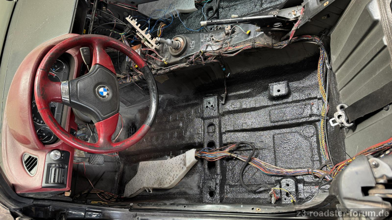 Der Wagen wurde bis auf das Armaturenbrett leer geräumt, entrostet, geschweißt und wieder schön hergerichtet (gummiert). Für den Zusammenbau Getriebe Revision, neues Fahrwerk, neues Lenkrad, neuer Teppich, Nachrüstung Ü-Bügel, neue Sitze, neue Mittelkonsole, neue Verkleidungsteile (auch von Dir), neue Türverkleidungen, neue Audioanlage, neue Spiegelfüße. Glaube das wars schon...