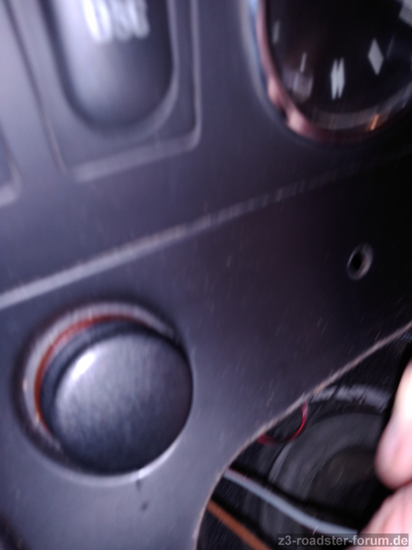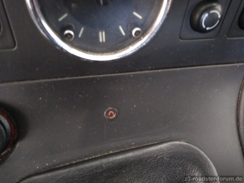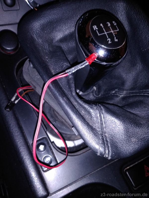 Nun habe ich unter dem Schaltsack nicht nur die besagte rote Leuchte sondern auch noch eine 2. weiße entdeckt. 2 diverse Kabelstränge sind mit Klebeband mit fahrzeugrelevanten Kabeln im Schacht dick umwickelt und gehen weit vorne in die Konsole rein. Auf dem Bild ist die 2. Birne (schwarze Fassung) schon ausgesteckt. Leider ist die Sicht / Platz zum Arbeiten = 0