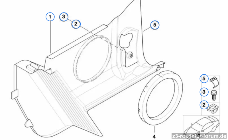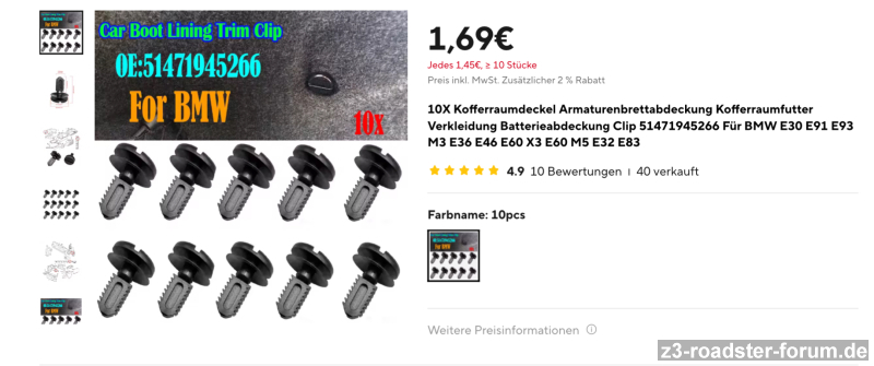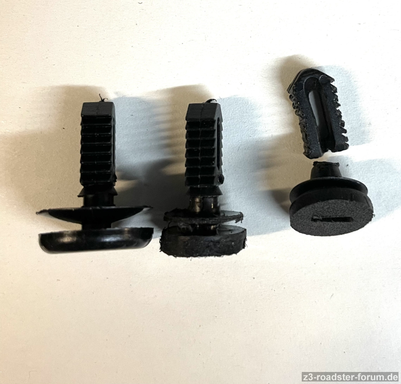 Für die Fußraumverkleidungen links,rechts, werden passende Clips BMW Teilenummer 51458116321 benötigt mit Kopf-Durchmesser von ca. 15mm. Momentan kostet einer mehr als 4€.