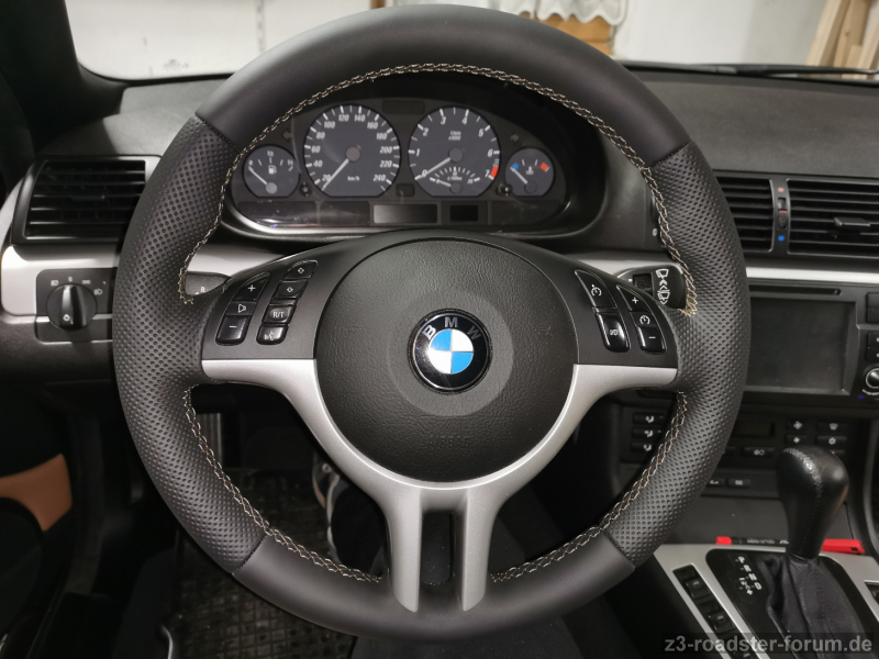 Mein Roadster hatte vor knapp 10 Jahren von der Sattlerei Stafjew ein topp Lenkrad in schwarz bekommen, weil das blaue Leder nicht mehr schön war.