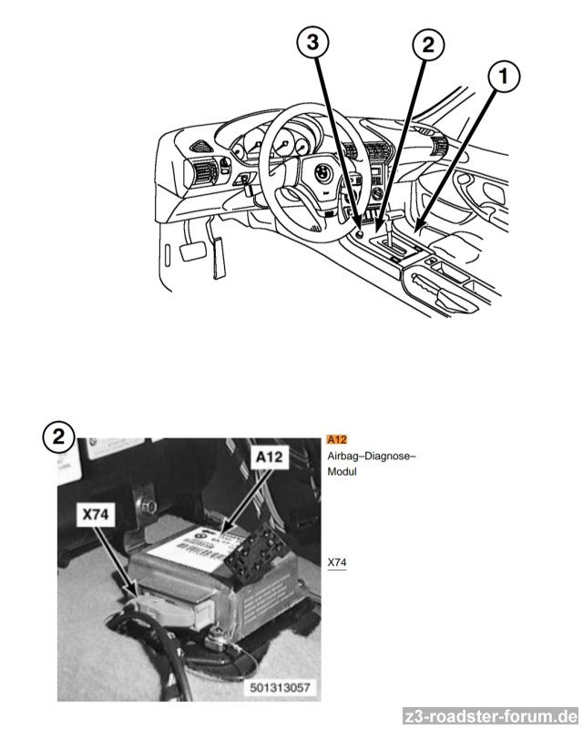 Wo sitzt denn das Airbagsteuergerät im Z3 1,9i, Bj. 2002?