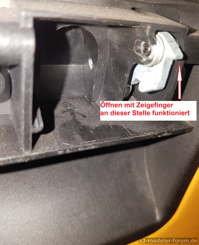 Die im Handschuhfachdeckel verbliebene Öffnungsmechanik funktioniert, denn öffnen mit Zeigefinger geht.