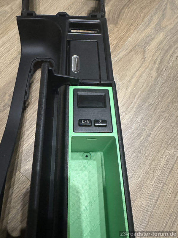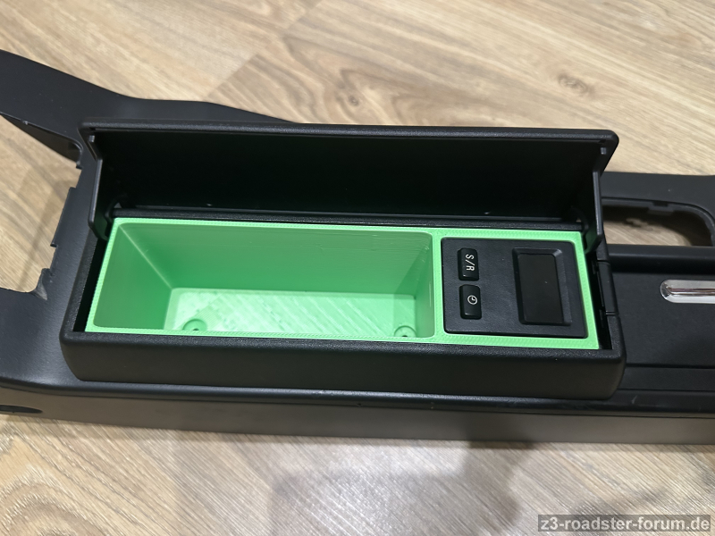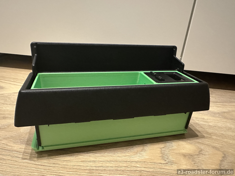 Ergebnis ist, das Ding kommt in das Kassettenfach was bisher eh nur mehr oder weniger als Armauflage und Stauraum verwendet wird, hierfür habe ich mir einen Einsatz konstruiert, wobei konstruiert etwas übertrieben ist, eher gezeichnet und dann 3D gedruckt.