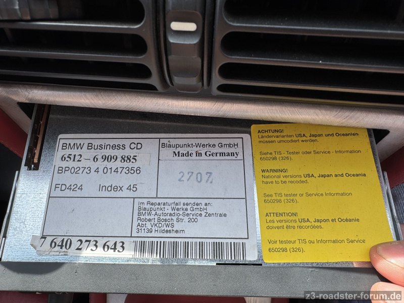 habe bei meinem im August erworbenen Z3 1.9i ein originales BMW Business CD-Radio nachgerüstet. Leider funktioniert der angebliche Code nicht. Kann mir jemand weiterhelfen? Anbei ein Foto vom Radio mit den Identifikationsmerkmalen. Danke! Beste Grüße, Marty