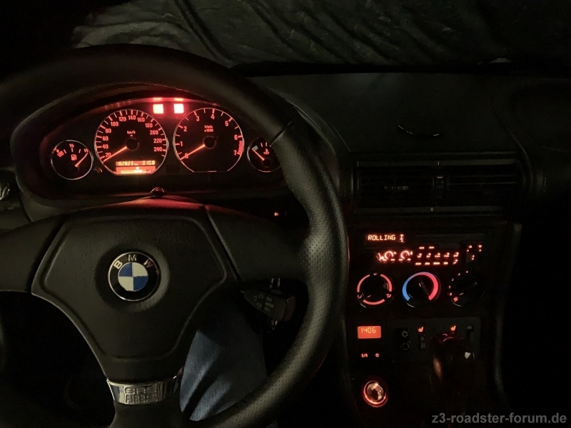 Anbei einige Bilder vom Radio im Z3 bei kompletter Dunkelheit und bei offenem Dach und Garagenbeleuchtung. Auf der Lenksäule oben ist die dazugehörige montierte Freisprecheinrichtung zu sehen. Ins Handschuhfach habe ich noch ein Kabel für den iPod gelegt, da das Radiogerät einen solchen separaten Anschluss auf der Rückseite hat. So kannst du ganz einfach am Gerät DAB+, FM, Musik vom Telefon über Bluetooth oder eben den iPod anwählen.