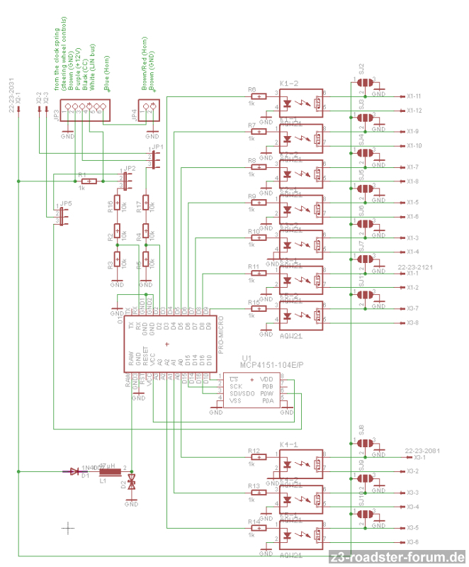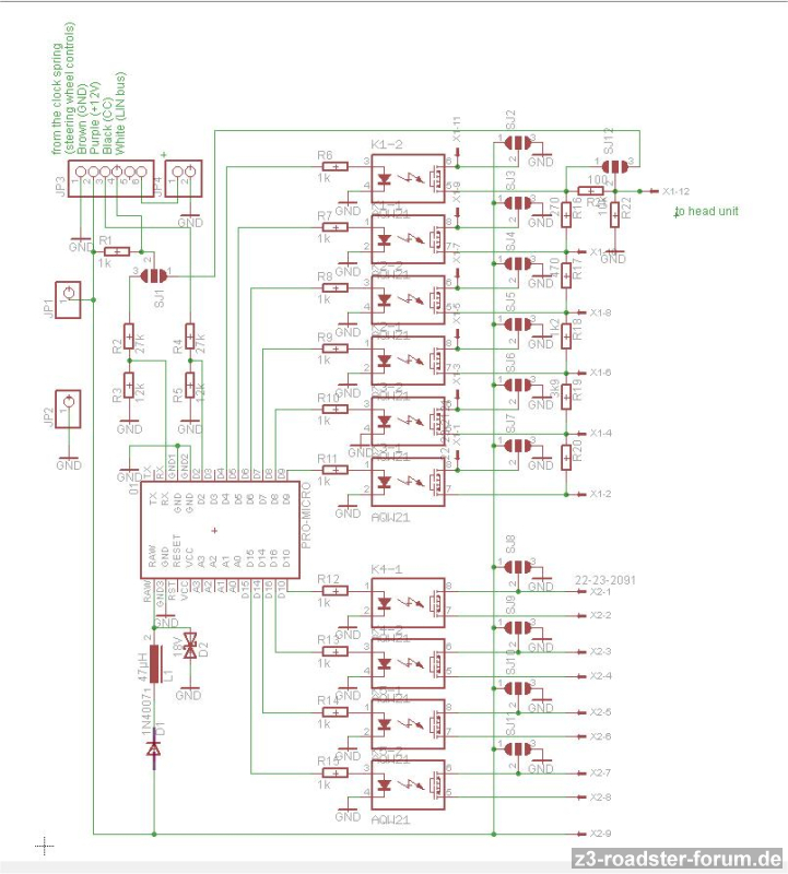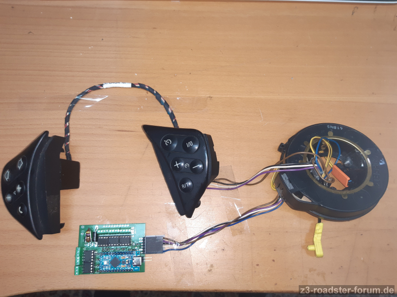 Die gesamte aktive Elektronik ist auf der Tempomatseite, dort werden die Widerstands-Signale der Radio-Tasten dann ausgewertet und als entsprechende Nachrichten auf dem I-Bus verschickt.