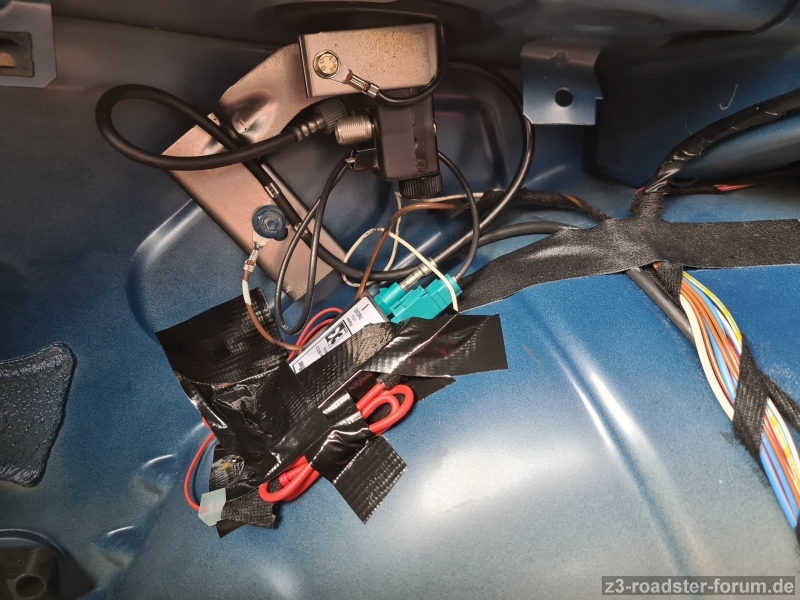 Damit konnte die umgebaute Antenne an den ATBB 4723.01 Antennenverstärker angeschlossen werden. Um den Verstärke an das Originalkabel anschließen zu können, habe ich den Adapter "Fakra (Buchse) - M10x75 Schraubanschluß (Stecker)" (143-ABB_2348_02) verbaut. Für die Stromversorgung wurde noch ein Adapter mit der Cripmzange gequetscht (Verbindung von zwei Flachsteckerbuchsen). Bei dieser Gelegenheit habe ich auch die Antennentülle getauscht.