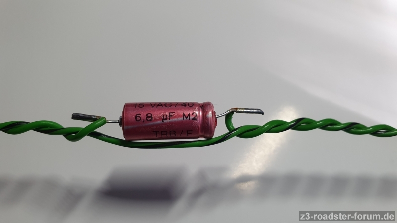 In dessen Zuleitung ist ein Tonfrequenzelko mit 6,8 µF eingelötet! Bei Austausch beachten!