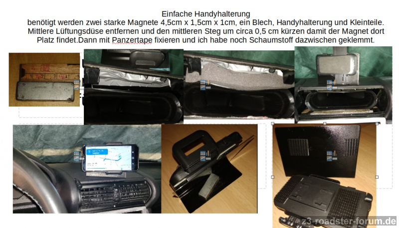 Mittlere Lüftungsdüse entfernen und den mittleren Steg in Richtung Motorhaube um circa 0,5 cm kürzen damit der Magnet dort Platz findet.Dann mit Panzertape fixieren und ich habe noch Schaumstoff dazwischen geklemmt.Dann zusammenbauen und schon die Hälfte erledigt.Dann ein Blech biegen, die Handyhalterung daran befestigen und dieses oben auf das Armaturenbrett setzen.