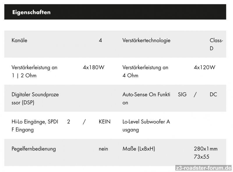 ich bin noch ganz neu im Forum und interessiere mich für ein Soundupgrade beim BMW Z3 Roadster. Leider bin ich auch auf dem Gebiet Car-Hifi noch ein ziemlicher Neuling. Nun habe ich nach einiger Recherche folgendes im Internet gefunden. Empfohlene Lautsprecher für die Tiefmitteltöner sind Eton Pow 13. Außerdem möchte ich gerne einen Subwoofer einbauen. Hierfür habe ich folgenden Beitrag gefunden: https://www.zroadster.com/forum/threads ... ach.19431/. Diese Subwoofer Kiste würde ich gerne nachbauen, und dort einen JL Audio 8w3v3-4 Subwoofer einbauen. Bei der Endstufe habe ich noch keine ganz konkreten Vorstellungen, sollte aber eine 4 Kanal Endstufe sein, wobei zwei Kanäle gebrückt den Subwoofer ansteuern und 2 für die Eton Lautsprecher mit Hochtönern da sind (hatte mir zum Beispiel eine Eton SDA 150.4 überlegt). Das Problem ist, dass ich das originale Radio behalten möchte (BMW Business RDS), welches über keine Cinch Ausgänge verfügt. Zudem weiß ich nicht genau ob das Auto aktuell über eine Endstufe verfügt und wie diese verkabelt ist. Ich hatte mir jetzt überlegt vom original Radio die Kabel für die zwei Frontlautsprecher abzugreifen (und an den Frontlautsprechern diese Kabel abzustecken) und mittels eines High-Low Konverters (falls dieser nicht aufgrund einer integrierten Funktion in der Endstufe entfällt) in die beiden Channel 1 und Channel 2 inputs meiner Endstufe einzuführen. Das Ganze würde ich gleichermaßen für Channel 3 und Channel 4 meiner Endstufe durchführen (Eingänge für den Subwoofer). Hier bereits meine erste Frage: Ist es möglich mittels einer Aufsplittung bzw. eines zweifachen Abgriffes am Kabel welches aus dem Radio zu den Frontlautsprechern geht alle 4 Eingänge der Endstufe anzusteuern? Aus der Endstufe sollen zwei Kanäle zu den Frontlautsprechern (Tiefmitteltöner) und zu den Hochtonlautsprechern gehen (Kann man ja jeweils ein paar Hochtonlautsprecher kombiniert mit einem Tiefmitteltöner mit einem Verstärkerkanal versorgen, oder?). Die Kanäle 3 und 4 der Endstufe sollen wie gesagt gebrückt zum Subwoofer gehen. Die beiden Lautsprecher hinter den Sitzen des Z3 würde ich dann einfach weiter über die Ausgänge für die hinteren Lautsprecher des original Radios ansteuern.