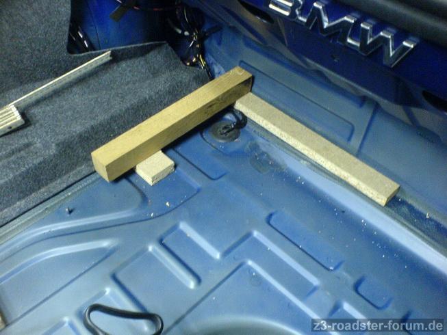 Ein weiteren Befestigungspunkt habe ich an dem schrägen Blech an der "Decke" des Kofferraums gefunden, wo früher der CD-Wechsel aufgehangen war, da mit einem Winkel dranzugehen ist wohl eher unmöglich, vielmehr müsste man dort eine Lochplatte s-förmig verbiegen...