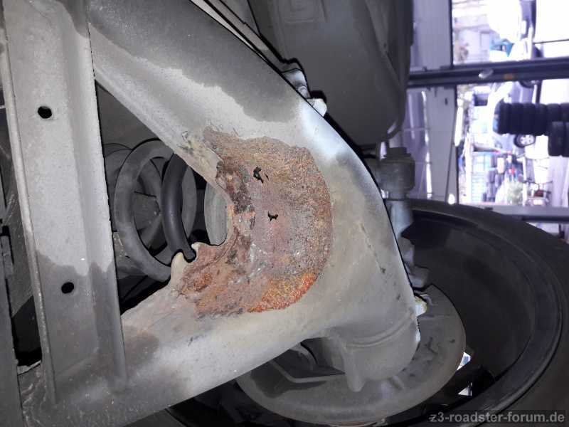 Nun habe ich leider ein kleines (oder eher großes Problem). Beim letzten TÜV wurde eine verherrende Diagnose gestellt. Der rechte, hintere Längslenker (Teilenummer ETK 33 32 1 094 762) ist sehr rostig. Glücklicherweise führte diese nicht zur Stilllegung sondern lediglich zum geringen Mangel. Allerdings ist der Zerfall nun schneller voran geschritten als erwartet. Mittlerweile sind Löcher vorhanden (Bild im Anhang)