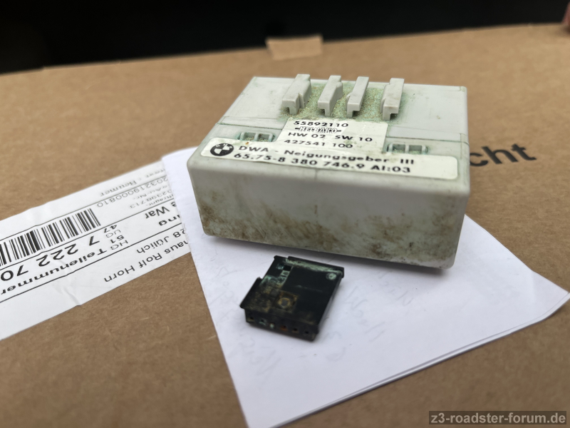 durch eine fehlerhaft verbaute linke Heckleuchte (eingeklemmte Dichtung) hatte ich Wasseinbruch in der Kofferraum-Mulde (ganz links unterhalb der Entlüftungsblende). Der Neigungsgeber stand komplett unter Wasser und ist korrodiert.
