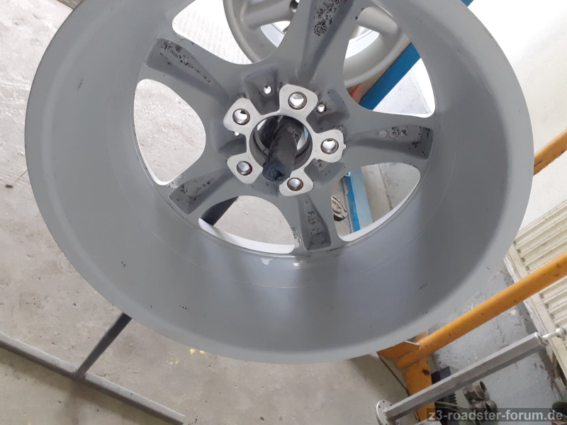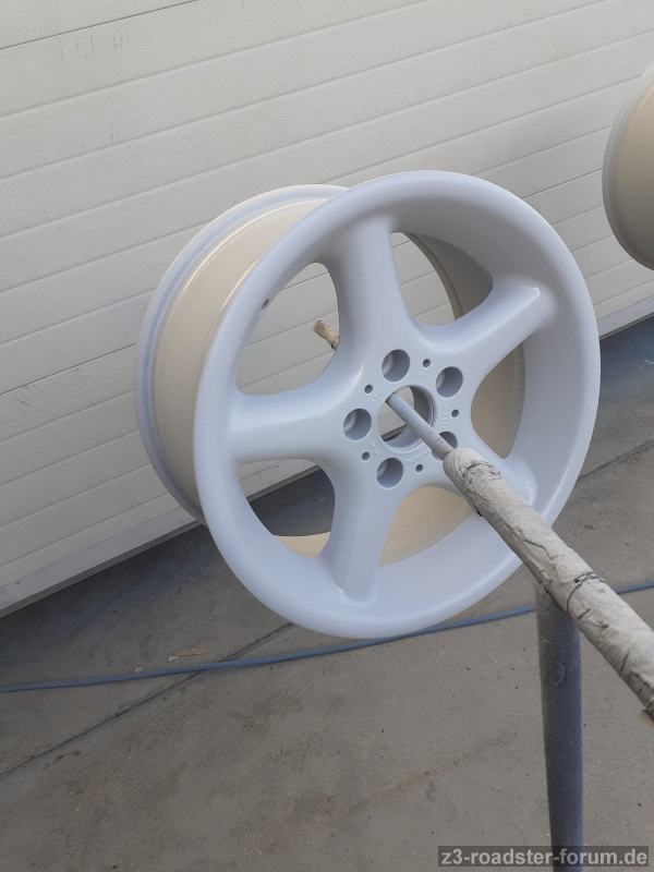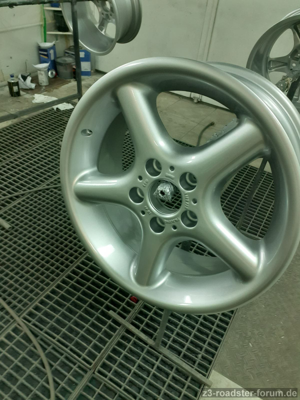 Die Felgen waren gebraucht mit paar überschaubaren Bordsteinkratzern. Dies kann man bei dem Alter auch nicht übel nehmen. Soeben sind die Felgen bei einer Meisterlackiererei abgegeben worden und ich habe eine vollständige Überholung angefordert. Die werden schleifen, grundieren / füllern, schleifen und anschließend in der Farbe "BMW B20 Decorsilber II Metallic" lackiert. Pulvern ist cool, das habe ich bei meinen anderen BMWs doch nichts kommt von dem Glanz an eine ordentliche Lackierung - daher habe ich diese Felgen lackieren lassen. Es wird die komplette Felge lackiert außer dem inneren "Felgenstern" der auf der Radnabe aufliegt.