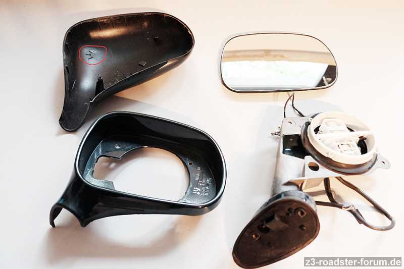 Das ist auch der einzige Makel - ansonsten ist technisch alles in Ordnung und vollständig. Lack ist BMW Uni Grün und in gutem Zustand - kann man sofort anbauen und sieht gut aus. Bei beiden Außenspiegeln ist die Verkabelung dabei. Die Sockel sind hier leider auch angegriffen - eine Z3-Schwäche. Der Rest ist wie gesagt in gutem Zustand, was den Lack betrifft.