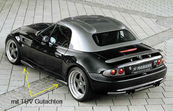 Verkaufe original Hamann Schwellerflügel mit TÜV-Gutachten und Anbauanleitung für alle Z3 incl. M-Roadster vor Facelift. Evtl. passen die aber auch an neuere Modelle. Die Flügel werden einfach mit den vorhandenen Schrauben der original Schweller befestigt. Der Anbau dauert je nach Geschick ca. 15 - 30 Minuten für alle vier Flügel. Die Flügel bestehen aus GFK und sind in jeder Farbe lackierbar. Zur Zeit sind die Flügel wie auf dem Bild in grau metallic. Die Flügel sind gebraucht und weisen an den vorderen Kanten Gebrauchsspuren durch Steinschlag auf, kann aber ohne große Probleme ausgebessert werden. Festpreis: EUR 150,00 plus Porto. (Der Neupreis liegt bei EUR 412,-) Bei Interesse oder für weitere Fragen bitte Email an [Mailadresse ist nur für registrierte Benutzer sichtbar]