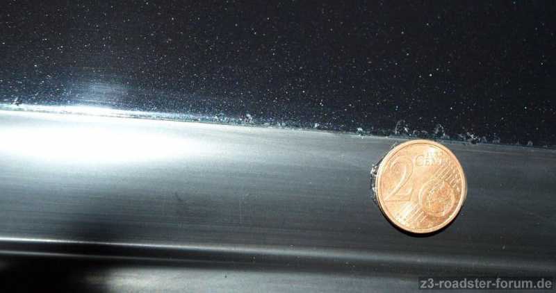 Leider gibt es ein kleines Manko: ich habe gesehen, dass auf der Fahrerseite an der Regenschutzleiste ein paar kleine Klarlackabplatzer sind. Das Hardtop wurde ja mal von grün auf cosmosschwarz umlackiert und da hat der Lackierer wohl die Regenschutzleisten nicht entfernt sondern nur drum herum lackiert. Der restliche Lack ist aber wirklich top!