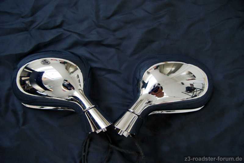 Der rechte Aussenspiegel hat ein sehr feines Bläschen unter der Chromschicht, der linke einen minimalen Kratzer von der Lagerung, beides ist kaum sichtbar.