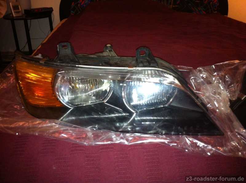 als erste Umbaumaßnahme an meinem neuen Z3 hab ich die Frontscheinwerfer gegen neue mit weissen Blinkern getauscht (unter anderem da sonst alle Blinker weisse Gläser haben). Nun habe ich ein Paar Frontscheinwerfer mit gelben Blinkergläsern übrig die ich euch zum Kauf anbieten möchte. Sie stammen aus einem Facelift Z3 aus dem Jahr 1999. Die Scheinwerfer haben bis vor einigen Tagen in meinem Auto ihren Dienst ohne Probleme getan.