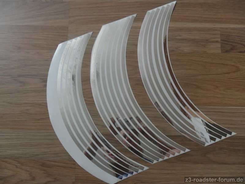 ich biete euch hier einen Satz Chromlook Felgenrand Aufkleber (8mm) für 17 Zoll Felgen an. Er besteht aus 18 vorgekrümmten Viertelkreisen (16 werden benötigt, also 2 als Reserve