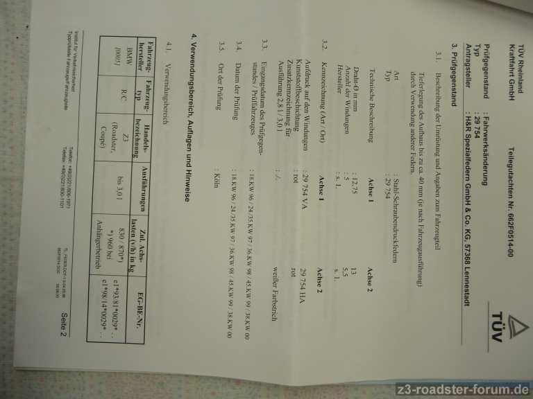 Es liegt ein Teilegutachten für alle Z3 Roadster und Z3 Coupe's, außer Z3M, bei.