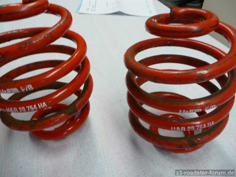 Die Federn wurden 2007 in meinen Z3 2.0 eingebaut und waren kein Jahr gefahren und dann wieder ausgebaut worden. Mir war der Wagen einfach zu tief und zu hart gefedert. Die Federn sind technisch 100% in Ordnung. Optisch schauen die hinteren Federn nicht mehr so gut aus, weil die Farbe abgeblättert ist.
