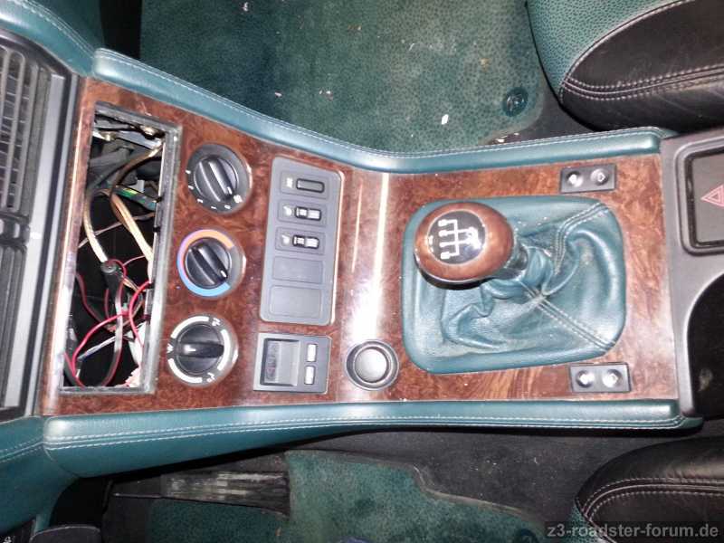 3) - Mittelkonsole in Edelholzausführung mit moosgrünen Seitenteilen (Nähte topp)