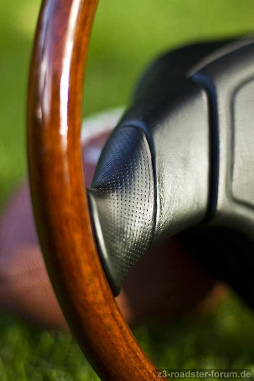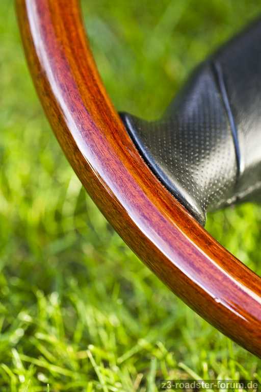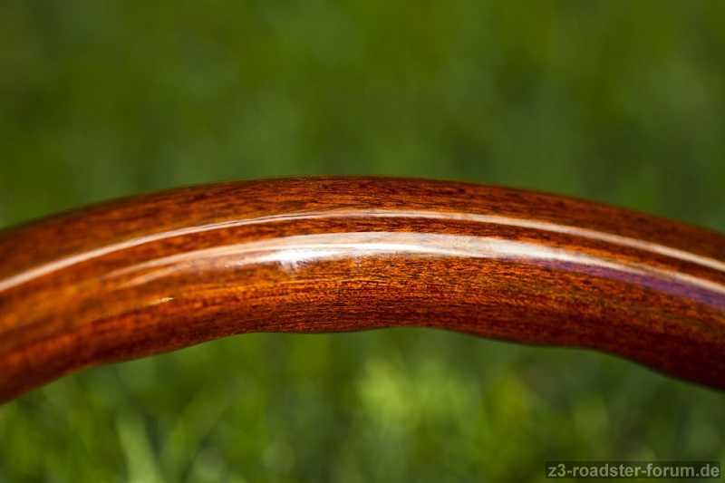 Das Holz zeigt keine Abnutzungspuren. Das Leder hat keine Risse, keine offenen Nähte kann aber eine Nutzung nicht verbergen. Die Kontakte der Hupe funktionieren. Mein Fahrzeug war/ist ein Nichtraucherfahrzeug. Insgesamt wurde das Lenkrad ca. 55.000km genutzt (der Z3 hatte bei Kauf 58.800km runter, bei ca. 4.000km wurde das Lenkrad montiert).