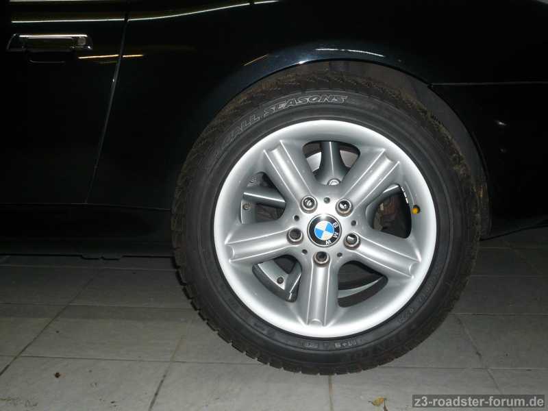 Biete hier original vier BMW-Felgen (Sternspeiche 43) 7x16 Zoll ET 47 mit M+S Reifen 225/50/16 Dunlop All Season. Reifen und Felgen in Top Zustand. Profiltiefe zwischen 6,4 mm und 7,7 mm. Die Felgen waren auf unseren Z3, werden aber nicht benötigt, da das Fzg. im Winter nicht bewegt wird. Passen natürlich auch auf viele andere BMW.