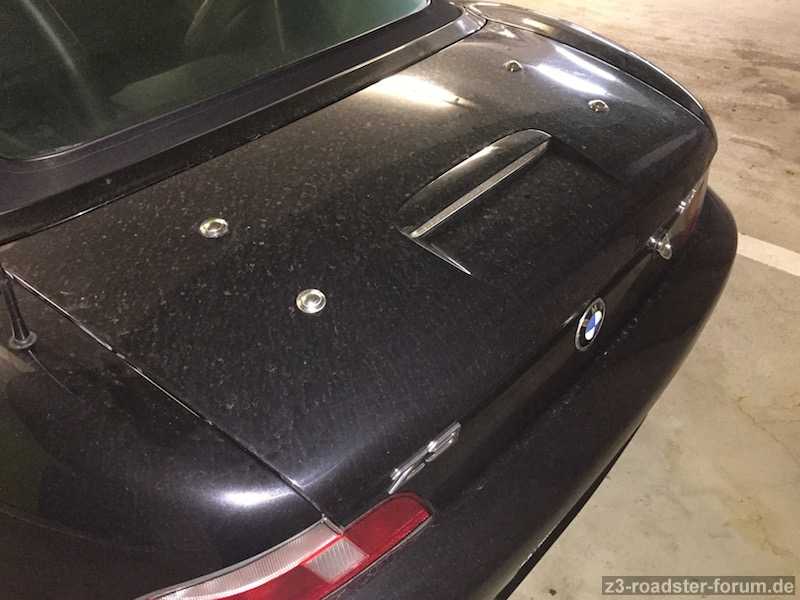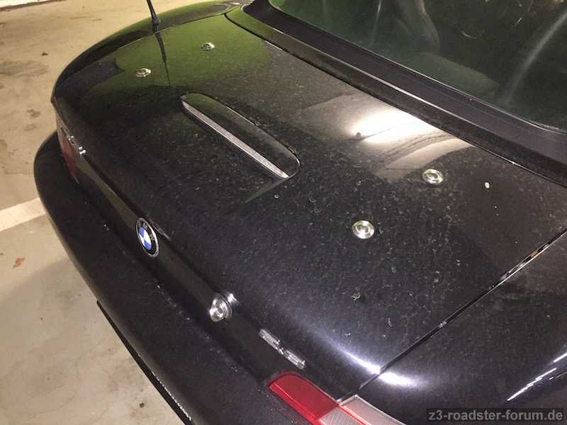 Meine Facelift Heckklappe mit der Vorrichtung für einen Gepäckträger. Die Farbe ist Cosmosschwarz und befindet sich in einem guten Zustand. Mir gefallen optisch die Chromepunkte nicht, deswegen das Angebot auf einen Tausch ohne diese. Die Modellbezeichnung "Z3" und "2.8" sind ebenso noch auf der Heckklappe.