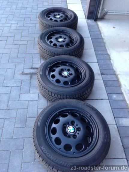 Die Felgen sind schwarz lackiert und weisen keine Bordsteinschäden o. ä. auf.