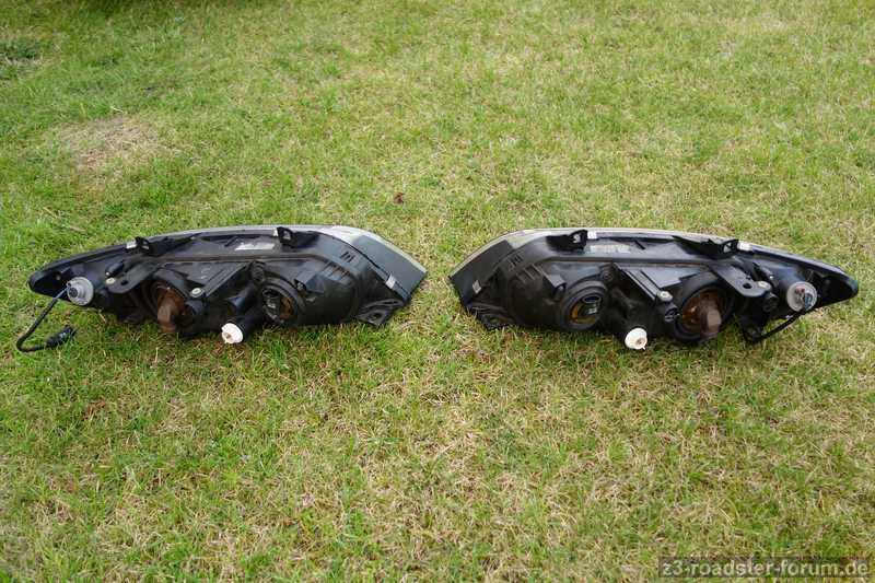 die Scheinwerfer haben weiße Streuscheiben (selber umgebaut mit der Backofenmethode). Dazu werden die alten gelben Streuscheiben ausgebaut und gegen weiße ersetzt, die anschließend mit Silikon fixiert werden.