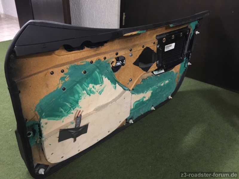 Die Zürverkleidungen wurden sehr aufwändig aufgebaut. Es wurde ein geschlossenes Gehäuse aus Multiplex angefertigt und mit einer halb zersägten Türverkleidung verbunden. Alles ist Handarbeit und es war wirklich sehr aufwändig. Anschließend wurden die Verkleidungen komplett mit Echtleder neu bezogen. Die Lautsprecher sind leicht angewinkelt, was den Mittelton enorm verbessert. Durch die geschlossenen Gehäuse spart man sich aufwändiges Dämmen der Türen. Nix rappelt und es kommt kaum Schall aus dem Auto.