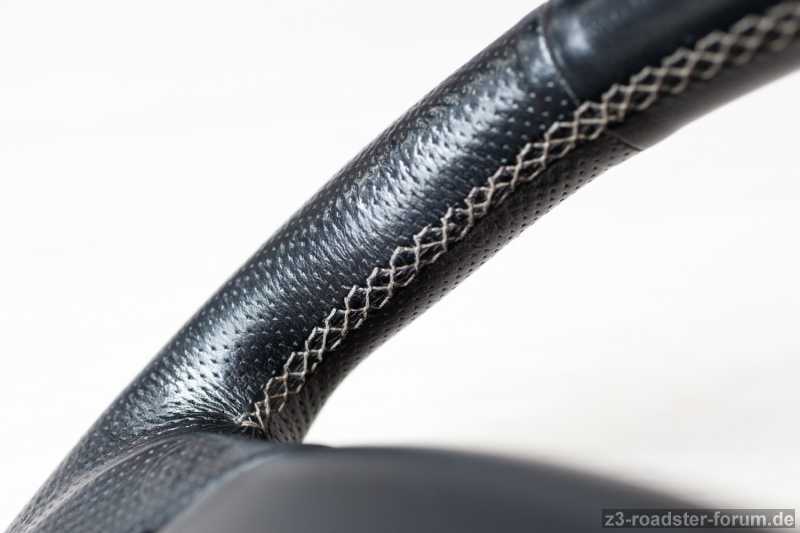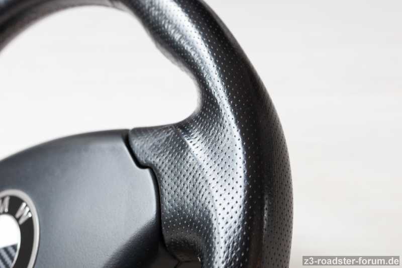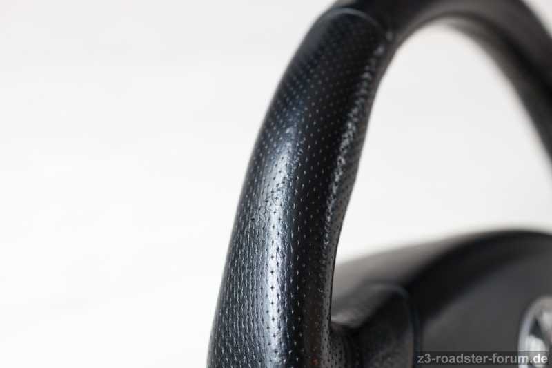 Das Lenkrad ist in einem guten Zustand. Das Leder weißt sehr wenig Abriebspuren auf. Lediglich an der linken Flanke ist eine kleine Abschirfung im Lochleder zu erkennen, welche aber nur bei genauem Betrachten auffällt. Im oberen Teil des Griffes war eine 12 Uhr Markierung angebracht (siehe Bilder).