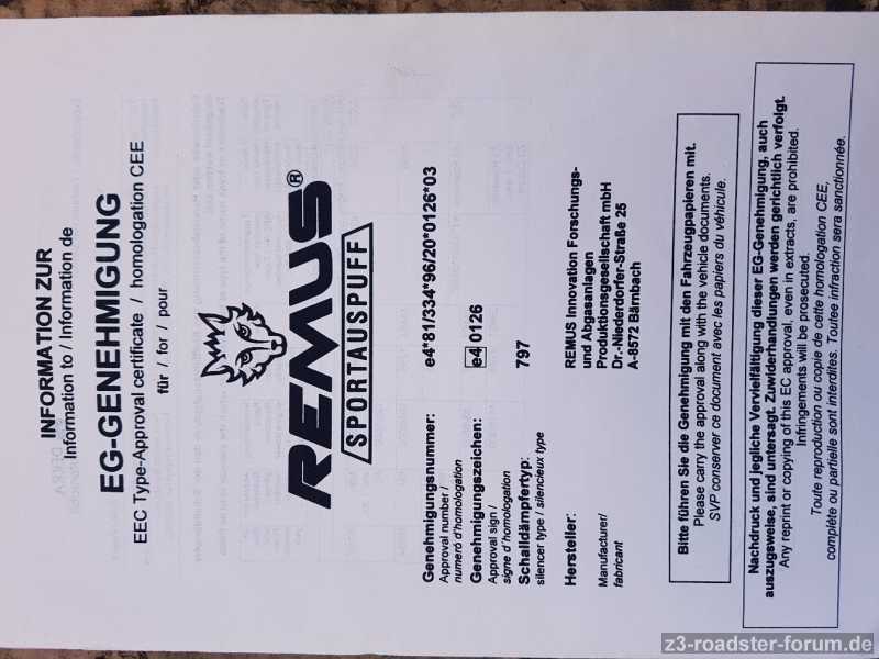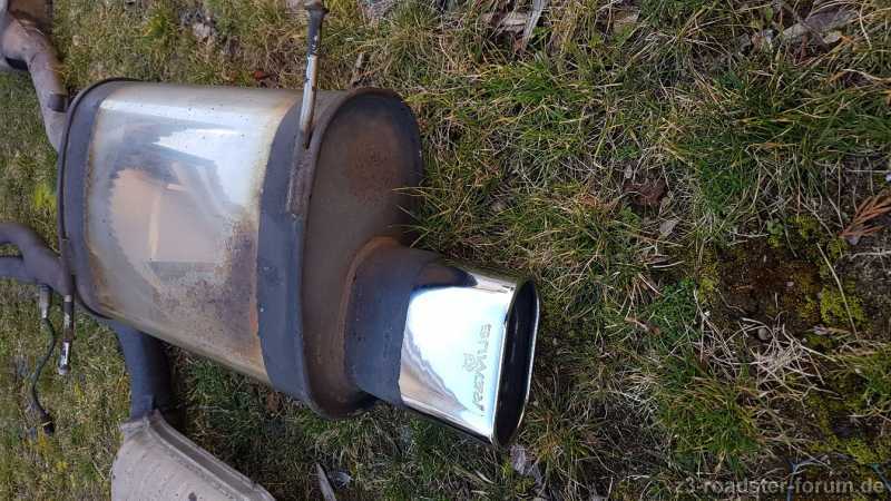 Ich biete einen gebrauchten Remus-Auspuff, Typ 797, komplett mit Kat samt Lambdasonde, Mittel- und ESD mit ovalem Endrohr 135x70 für folgende BMW Z3-Modelle:
