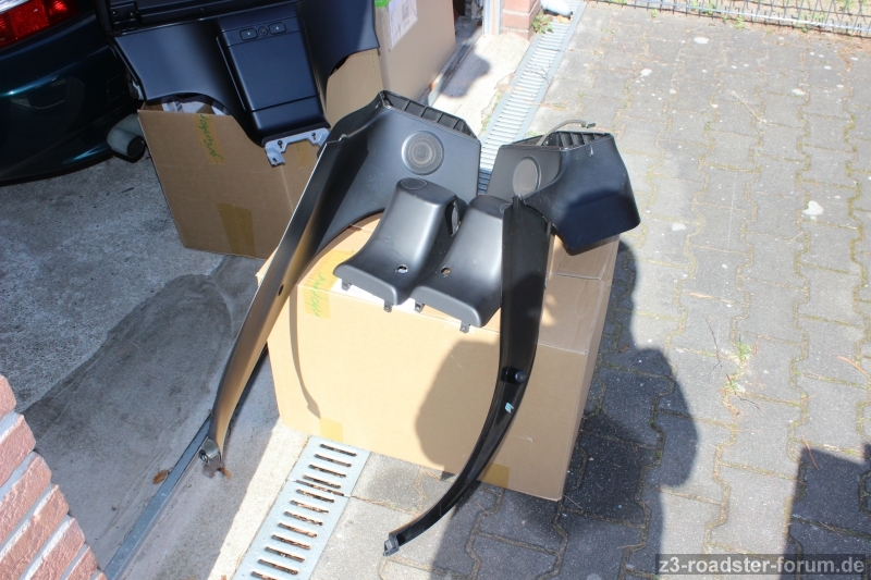 nach dem Einbau von Original-Überrollbügeln biete ich nun die ursprüngliche (ohne Überrollbügel) Ablagebox, die hinteren Seitenverkleidungsteile mit funktionierenden Lautsprechern und die Höcker (mit Bohrungen für das Windschott) an. Die Oberfläche ist glatt (VFL). Die Teile sind alle gut erhalten, es ist nichts gebrochen. Einzig auf dem Deckel der Ablagebox ist mittig eine kleine "Schleifspur" vom Windschott. Das Befestigungsmaterial ist vorhanden. Bei Interesse kann ich gerne detaillierte Bilder zusenden. Meine Preisvorstellung ist € 180,--.