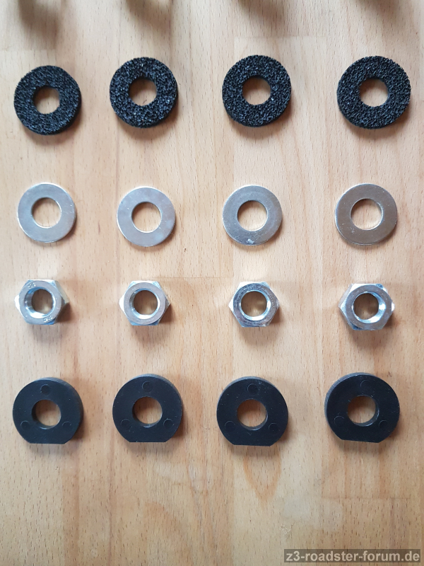 Zudem sind die Kunststoffdistanzen für die Montage dabei; orig. ist dieser viermal in drei unterschiedlichen Stärken zum Einschieben zwischen die Außenhaut des Kofferdeckels und der inneren Verstrebung vorhanden, hier viermal eine dicke, welche auf das Maß geschliffen werden muss.