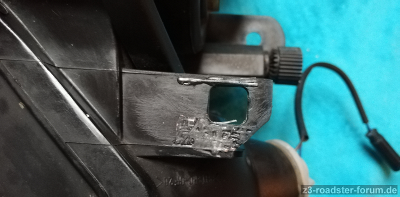 Der untere, äußere Halter hatte einen Riss und wurde verklebt und mit Glasfaser stabilisiert/verstärkt.