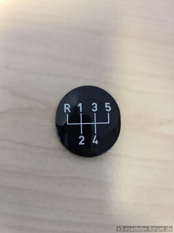 Damit habe ich diesen Schaltknopf neu bezogen und die alte Plakette wieder eingesetzt; die Plakette ist optisch arg mitgenommen und sollte durch eine neue ersetzt werden.